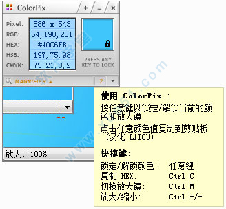 colorpix是一款帮助你快速在屏幕上取色的工具,并且能根据你取的颜色得到Pixel、RGB、HEX、HSB、CMYK代码。软件体积小巧,功能强大,用户移动鼠标即可在屏幕上取色,并且生成的代码还能够自动复制保存到剪贴板,非常方便实用。本站提供软件的中文绿色版下载端口,软件下载无需安装即可使用,打开软件后,桌面会弹出一个颜色信息框,鼠标经过的地方即为取色的区域,是目前设计人员、美工人员最好的取色软件,欢迎有需要的朋友免费下载使用。