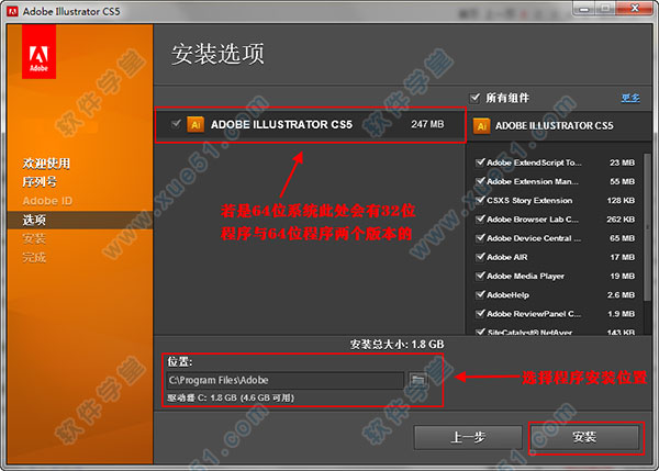 4、然后进入安装内容界面了,由于小编的系统为32位,下面的图则只有一个安装选项,若是64位系统的朋友则会有32位与64位两个安装内容,可选择都安装也可只安装一个。