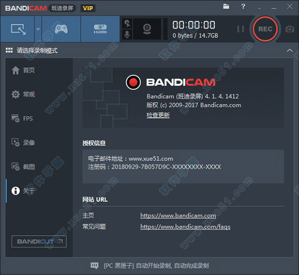 Bandicam提供了三种录制模式;屏幕录制模式、游戏录制模式、设备录制模式