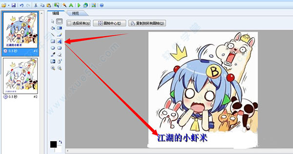 4、我们在第一张图片的编辑模式下,选择“文字工具”,在图片上输入内容:江湖的小虾米:,设置大小,颜色等。