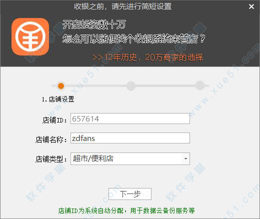 4、进入软件主界面,需要设置你的店铺名称、店铺类型,电话号码、登录密码等,自行设置,点击下一步
