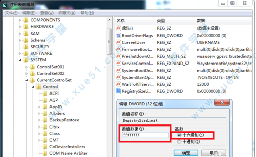 11、我们双击打开【RegistrySizeLimit】,此时将弹出如下图所示对话框,我们在弹出的【编辑 DWORD(32位)值】窗口中选择基数为【十六进制(H)】,然后在数值数据(V)栏中输入 ffffffff。