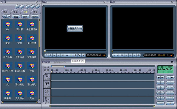 1、界面:自由组合的窗口模式;使用方便的项目及素材管理器;输入、输出双监视窗口;四个编辑轨道的时间轴;