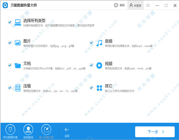 3、操作简单易懂软件界面显示了所有可供恢复的类型,傻瓜式操作,小白也能轻松上手。