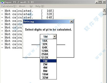 3、界面很简单,从最少的16K(小数点后16000位)到最多的32M(3200万位),Super Pi都可以计算。超频界最常用的计算位数,就是1M(精确的说是小数点后的104万位)。点击左上角的Calculate。