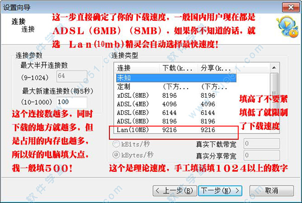 1、正确设置你的下载上传速度,下一步是选择连接速度,也就是你家的宽带的速度,这个直接关系到你以后下载速度的快慢,一般国内用户现在都是ADSL(6MB)或(8MB),如果你不知道的话,就选 Lan(10mb)精灵会自动选择最快速度。