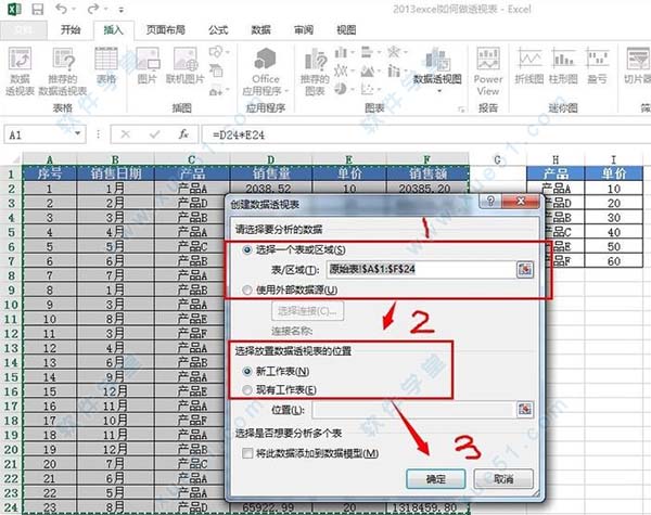 3、触发“数据透视表”按钮后,会看到弹出“创建数据透视表”选项卡,这里面可以选择的有三个地方:第一个是你数据源区域,在这里你可以重新选择或更好数据源区域;第二个是你要在什么地方生成数据透视表,可以在新表生成或者指定在某个位置生成;第三个是选择好以后就点确认。我这个例子是默认在新表生成,你看我最后在新表位置生成了一个数据透视表。