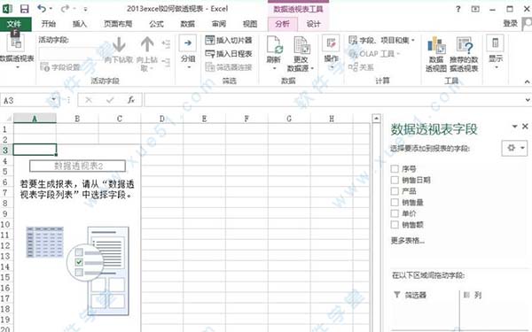 4、这个时候大家可以看到右侧弹出的就是数据透视表工具栏,大家可以看到源数据表头的各个字段,这个时候就可以往右下角区域拖拽字段进行透视展现。例如我要知道各种产品的销售量汇总,我先把“产品”拖到“行”区域,然后把“销售量”拖到“值”区域,这样一个基于产品统计销售量的透视表就生成了。