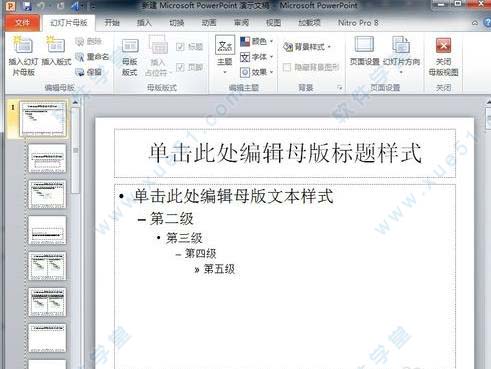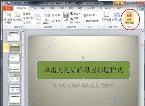 第三步:再按需要设置其它格式,设置完成后再切换到“幻灯片母版”选项卡,单击最后面的“关闭母版视图”按钮退出母版编辑模式: