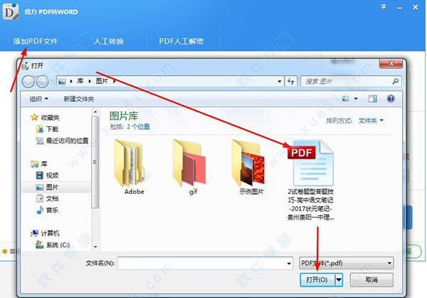 1、打开得力pdf转word,点击“添加PDF文件”,然后选择你要要转换的PDF文件。