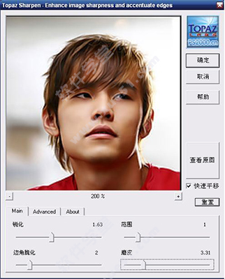 打开素材文件,按下CTRL+J复制背景图层,执行Topaz Sharpen滤镜。 弹出如图对话框。