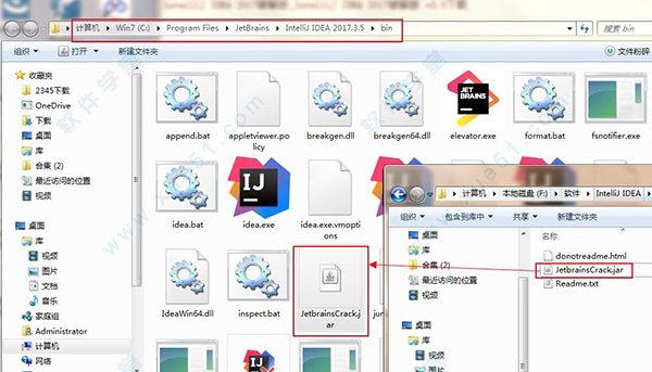 2、然后回到软件安装包打开Jetbrains.IDE.Crack文件夹,将“JetbrainsCrack.jar”这个破解补丁复制到软件安装路径bin文件下,默认目录为:C:Program FilesJetBrainsIntelliJ IDEA 2017.3.5bin