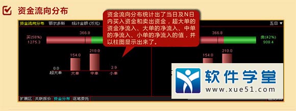 资金流向分布统计出了当日及n日内买入资金和卖出资金,超大单的资金净流入、大单的净流入、中单的净流入、小单的净流入的值,并以柱图显示出来。