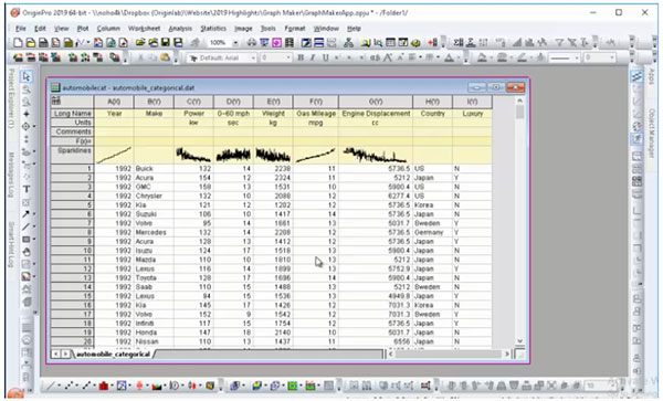 2、列视图中的行与默认工作表视图中的列的使用方式是相同的。 你可以从列视图中选择多行,创建绘图并执行可用于工作表列的任何操作,例如平滑或曲线拟合。
