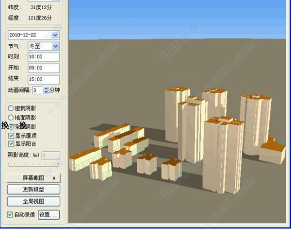 2、日照仿真:应用三维渲染技术,提供可视化的日照仿真,直观指导建筑规划,并可作为最具说服力的日照计算验证。提供选择需要生成阴影的建筑物、只显示投影在建筑外表面上的阴影、屏幕截图等功能。