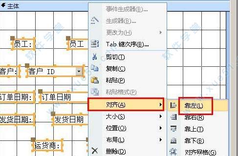 4、得到的这个窗体比较凌乱,我们选中这些字段,右键单击这些字段,然后再菜单中选择【对齐】--【靠左】,这样他们就以最左边的字段对齐了。