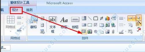 5、接着在【设计】选项下,点击【主子窗体】控件,选择该控件以后鼠标键变成了一个控件的样子