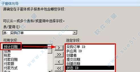 7、从采购订单中选择需要使用的字段,点击添加按钮就可以将字段田间道选定字段中,也就是添加到了窗体中,点击下一步