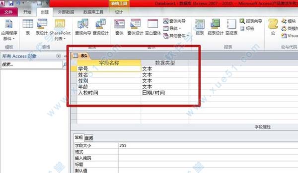 2、在打开的设计视图中输入你所要创建的表的字段名称,并选好每个字段对应的数据类型