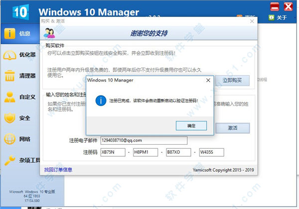 3、重启软件,这时我们可以看到软件已经完成破解,至此,Windows 10 Manager 3.0.2中文破解版成功注册授权,用户可以无限制、永久免费使用本软件了