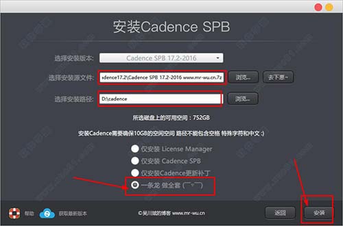 2、选择安装版本为Cadence SPB 17.2-2016,选择安装源文件:就是您在本站下载的另外一个还没解压的“Cadence SPB 17.2-2016 www.mr-wu.cn.7z”压缩包,选择安装路径为英文路径,然后选择“一条龙 做全套”点击安装;