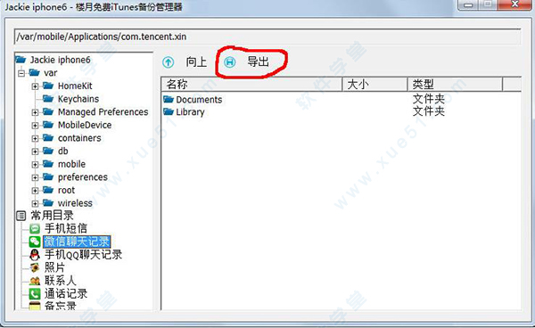 三、在弹出窗口上就可以查看到该苹果设备上的所有文件了,我们可以单击选中任意文件夹或文件,再点击“导出”按钮将其导出到电脑上的任意目录下。以下为几个常用目录,我们可以一步步点击进入该目录,也可以直接点击左边“常用目录”下方的相应项,快捷进入该目录。