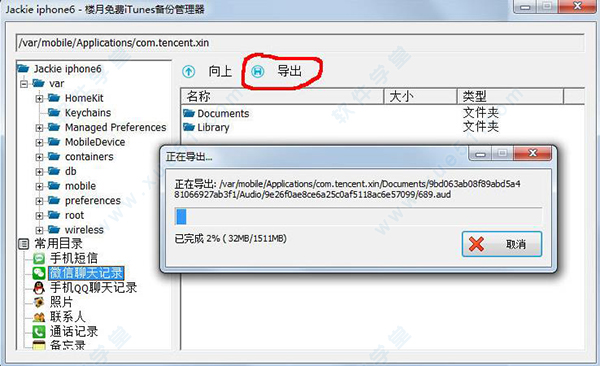 四、导出时,窗口上会显示当前导出的进度,如下图中,本人正在导出微信聊天记录所在的Documents文件夹,该文件夹共有1511MB(即大约1.5GB),现在已导出32MB,完成了总进度的2%。当所有文件都导出完成后,进度窗口将会自动消失,当看不到进度窗口后,就说明已经导出完成了。
