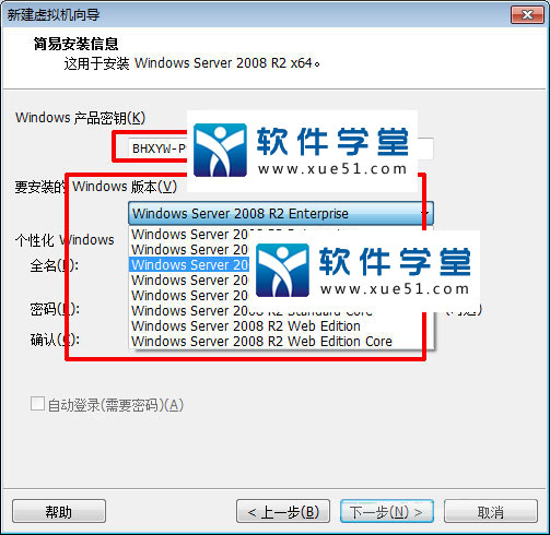 6、输入win2008 r2安装密钥【BHXYW-P9HCT-2VBWG-VF9K7-KKRK8】,并选择好需要安装的版本,这里小编当然选择企业版【windows server 2008 r2 enterprise】,全名和密码可以自行设置,这里小编不设定直接下一步;