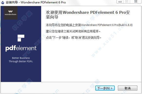 1、下载并解压软件安装包压缩包,然后双击运行“pdfelement6-pro_full2990.exe”程序进行软件安装,弹出界面,安装语言选择简体中文