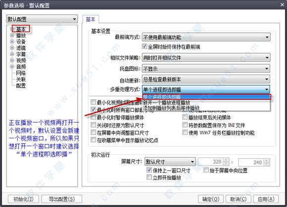 正在播放一个视频再打开一个视频时,默认设置会新建一个视频窗口,所以如果只想打开一个窗口时建议选择“单个进程即选即播”