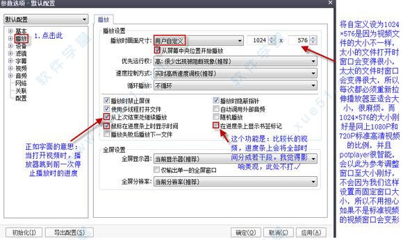 将自定义设为1024x576是因为视频文件的大小不一样,太小的文件打开时窗口会变得很小。太大的文件打开时窗口会变得很大,所以每次都必须重新拉伸播放器至适合大小,很麻烦。而1024x576的大小刚好是网上1080P和720P标准高清视频的比例,并且potplayer很智能,会以此为参考调整窗口至大小刚好,不会因为我们这样设置而固定窗口大小,所以不用担心如果不是标准视频的视频窗口会变形