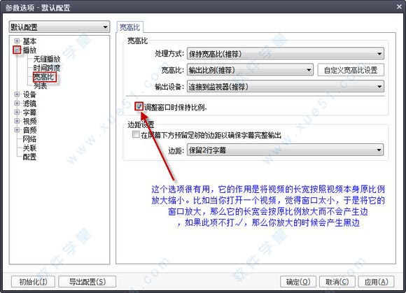 这个选项很有用,它的作用是将视频的长度按照视频本身原比例放大缩小。比如当你打开一个视频,觉得窗口太小,于是将它的窗口放大,那么它的长度会按原比例放大而不会产生边,如果此项不打√,那么你放大的时候会产生黑边