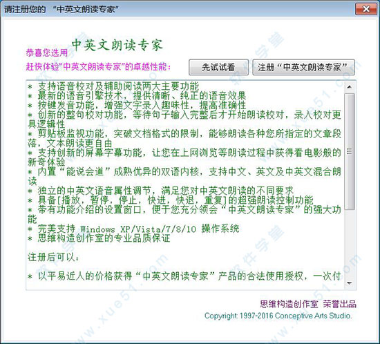 3、内置了成熟、优异的“能说会道 XP”双语内核,可以方便的进行中文、英文及中英文混合内容的朗读;