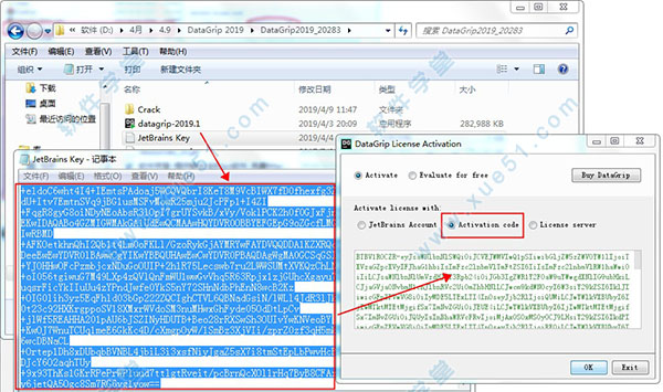 3、根据提示进行,直到这一步,选择activation code,然后回到软件安装包,打开JetBrains Key记事本文件,将里面的DataGrip注册激活码复制到此方框内