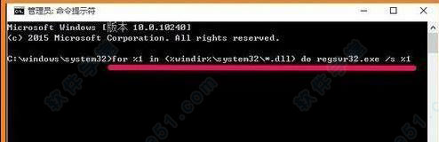 3、点击:编辑- 粘贴以后,for %1 in (%windir%system32*.dll) do regsvr32.exe /s %1 命令就复制到了管理员命令提示符窗口中(这样操作,输入的命令不会出现错误),按下键盘上的回车键。