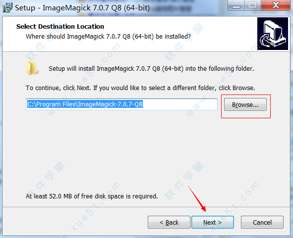 2、自定义选择软件安装路径,默认存储路径是“C:\Program Files\ImageMagick-7.0.7-Q8”,点击“Next”继续安装。