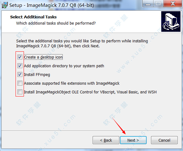 3、勾选是否创建桌面图标、添加应用路径到系统路径、安装FFmpeg等附加操作,点击“Next”进行安装。