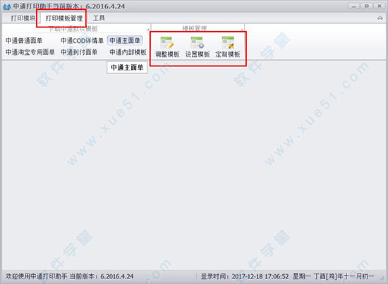 2、打印模块管理:你可以下载中通默认末班,包括中通普通面单、中通淘宝专用面单、中通到付面单等,还可以对模板进行调整,或者定制模板;
