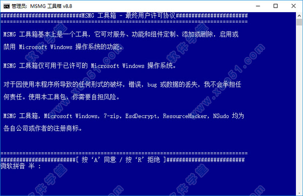 3、回到文件夹根目录,右键以管理员身份运行ToolKit.cmd,进入MSMG Tookit 使用的协议,输入“A”接受协议进入程序,输入“B”拒绝协议关闭程序,如下图:
