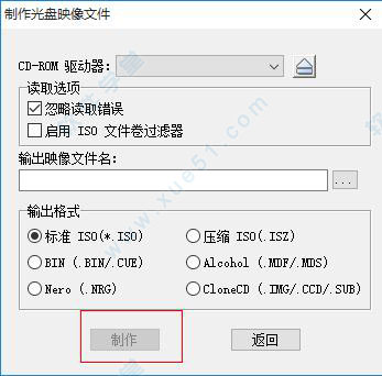 2、弹出“制作光盘映像文件”对话框,选择光盘驱动器,设定读取选项,指定映像文件名,选择输出的格式,包括标准ISO,压缩ISO,BIN,Alcohol,Nero,CloneCD等