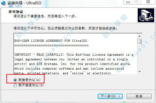 1、下载并解压软件中文破解版安装包压缩包,然后运行uiso97简体中文版.exe程序进行软件原版安装,进入安装向导界面,点击我接受协议,同意软件相关许可协议