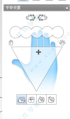 5、右边的手势设置工具,以三角区域的十字为准心,左右滑动为指间的角度。上下滑动为手掌的握和放的程度,滑动到最下即为拳头,滑动在最上方即为手掌。每个手指对应的圆形为手指锁,按下锁的手指将保持当前状态不受三角调整的影响