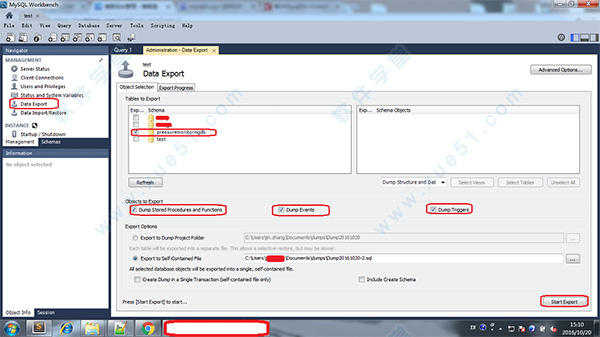 2、 点选要输出的数据库,点击【Data Export】,选择要输出的数据库以及是否输出存储过程和函数,事件,触发器,最后点击Start Export开始导出;