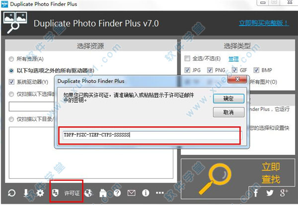3、然后点击许可证,再点击输入许可证密钥,弹出注册界面,接着回到软件安装包,打开序列号记事本文件,将记事本文件文件内Duplicate Photo Finder注册码:TDPF-PSZC-YZEP-CYPS-SSSSSS复制到软件注册界面方框内,如下图所示: