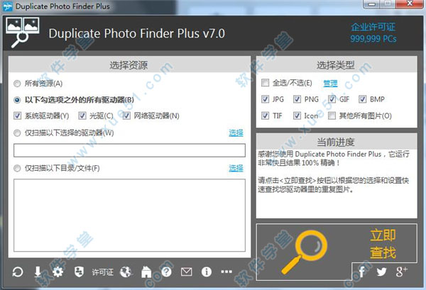 Duplicate Photo Finder Plus是一款重复图片查找软件,查找速度快,有时候有相同的图片我们都不知道,然后发现了要一张一张的找,不仅麻烦,而且费时间,通过使用这款软件可以快速帮你查找出相同的图片。它支持JPG、PNG、GIF、BMP、TIF、ICON等格式,使用智能选择功能自动检查不需要的图片,按照大小降序对结果进行排序,并通过不同的颜色标记相邻的重复图片组,以便您方便地操作重复的图片。软件操作简单,只需选择资源、类型,然后点击“立即查找”按钮即可快速查找,非常方便。小编给大家带来了