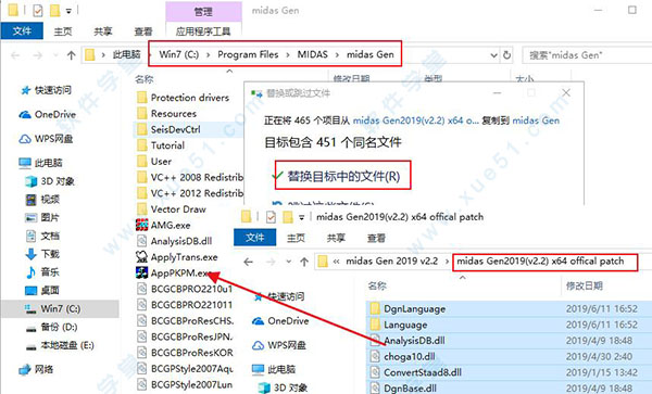 2、安装完成完成后将midas Gen2019(v2.2) x64 offical patch内的全部破解补丁复制到C:Program FilesMIDASmidas Gen安装目录下替换原文件