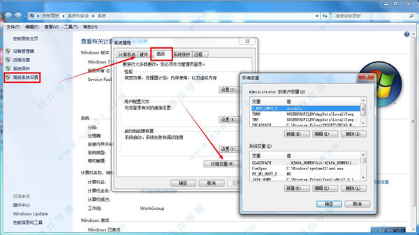 4、回到电脑桌面,依次点击“计算机”—“属性”—“高级系统设置”—“高级”—“环境变量”。
