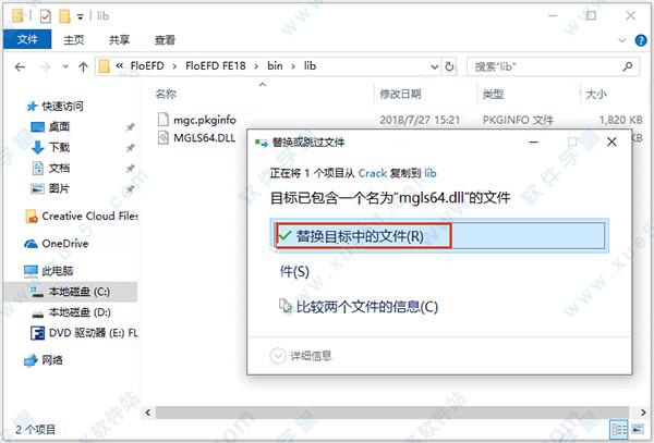 5、接着复制破解文件“MGLS64.DLL”文件到软件安装目录下的lib文件夹内,替换原文件,默认软件的安装路径为:【C:\Program Files\FloEFD\FloEFD FE18\bin\lib\】。