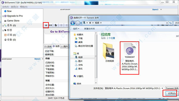 1、点击“加号”按钮,选择电脑中的种子文件,点击打开开始下载。
