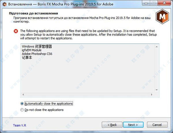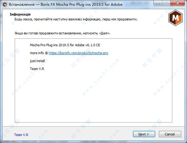2、直接双击“Boris FX Mocha Pro 2019.5 Adobe v6.1.0 CE.exe”程序开始安装,在起始界面中直接点击“Next”。